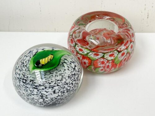 2 Vintage glazen presse – papier: 1 met rups op een blad en wit blauwe gevlekte patroon en 1 rood, groen en witte bloemen als waxinelichthouder