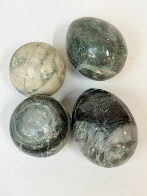 4 Groene natuurstenen: 2 eieren (diameter: 6.5 cm) + 2 bollen (diameter: 5.5cm)
