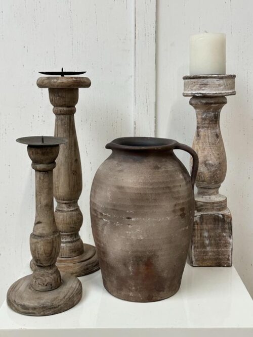 4 Vintage items: 3 grote houten kandelaars (h:26, 36 en 37 cm) + 1 grote aardewerk vaas (diameter:17 en h:26 cm)