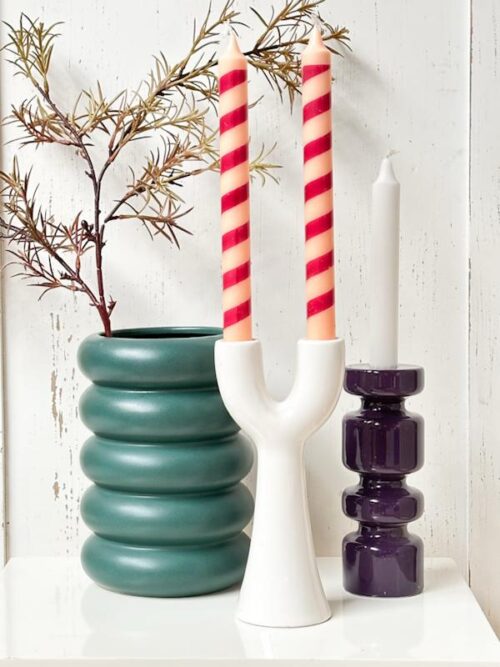 3 Vintage porseleinen items: 1 vaas (diameter:16 en h:22 m) + 2 kaarshouders ( h:19 en 22 cm )
