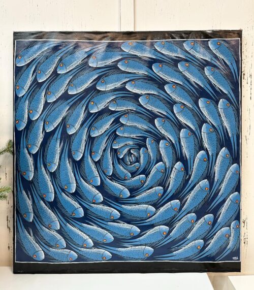 Olieverf “blauwe spiraal van vissen” op canvas gesigneerd