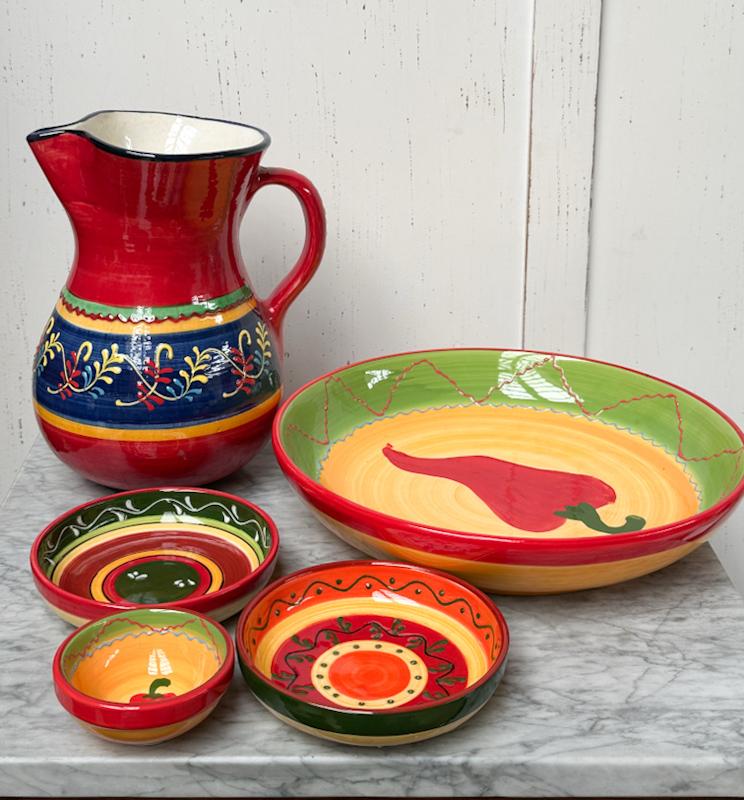 1 Grote porseleinen kan ( diameter:13 cm en h:23 cm) + 1 grote porseleinen serveerschaal (diameter:26 cm) +3 kleine schalen (diameter: 2stuks:12cm en 1 stuk 7cm)