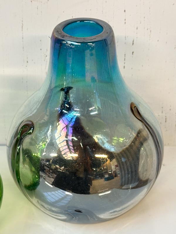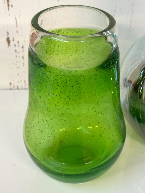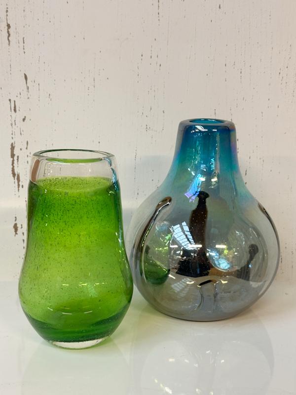 2 Mooie design glazen vazen: groen vaas Anthony Nederland (diameter:11 cm en h:19 cm) + blauwe parelmoer vaas uit Mexico ( diameter:18 cm en h:23 cm)