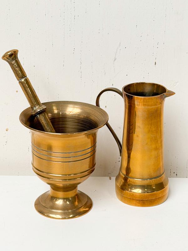 2 Vintage bronzen items: 1 kannetje (h:13 cm) + 1 vijzen met stamper(diameter:9.5cm en h:10 cm)