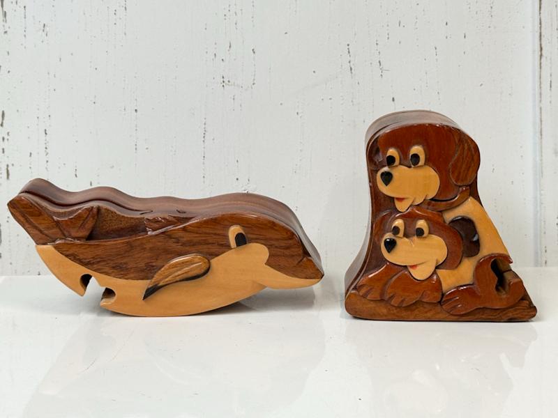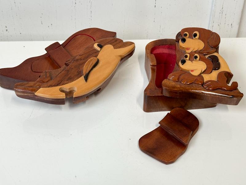 2 Vintage houten puzzel boxen: hond en dolfijn
