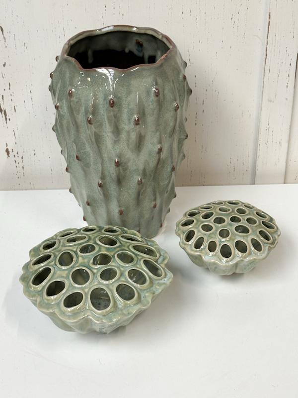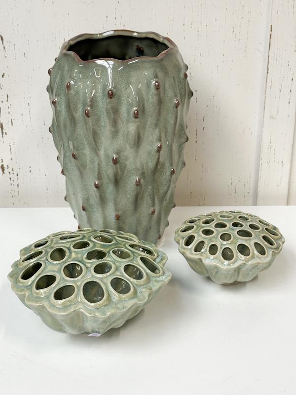 3 Groene design vazen, (2 stuks Des Pots vazen)
