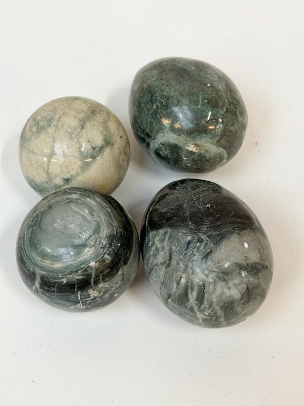 4 Groene natuurstenen: 2 eieren (diameter: 6.5 cm) + 2 bollen (diameter: 5.5cm)