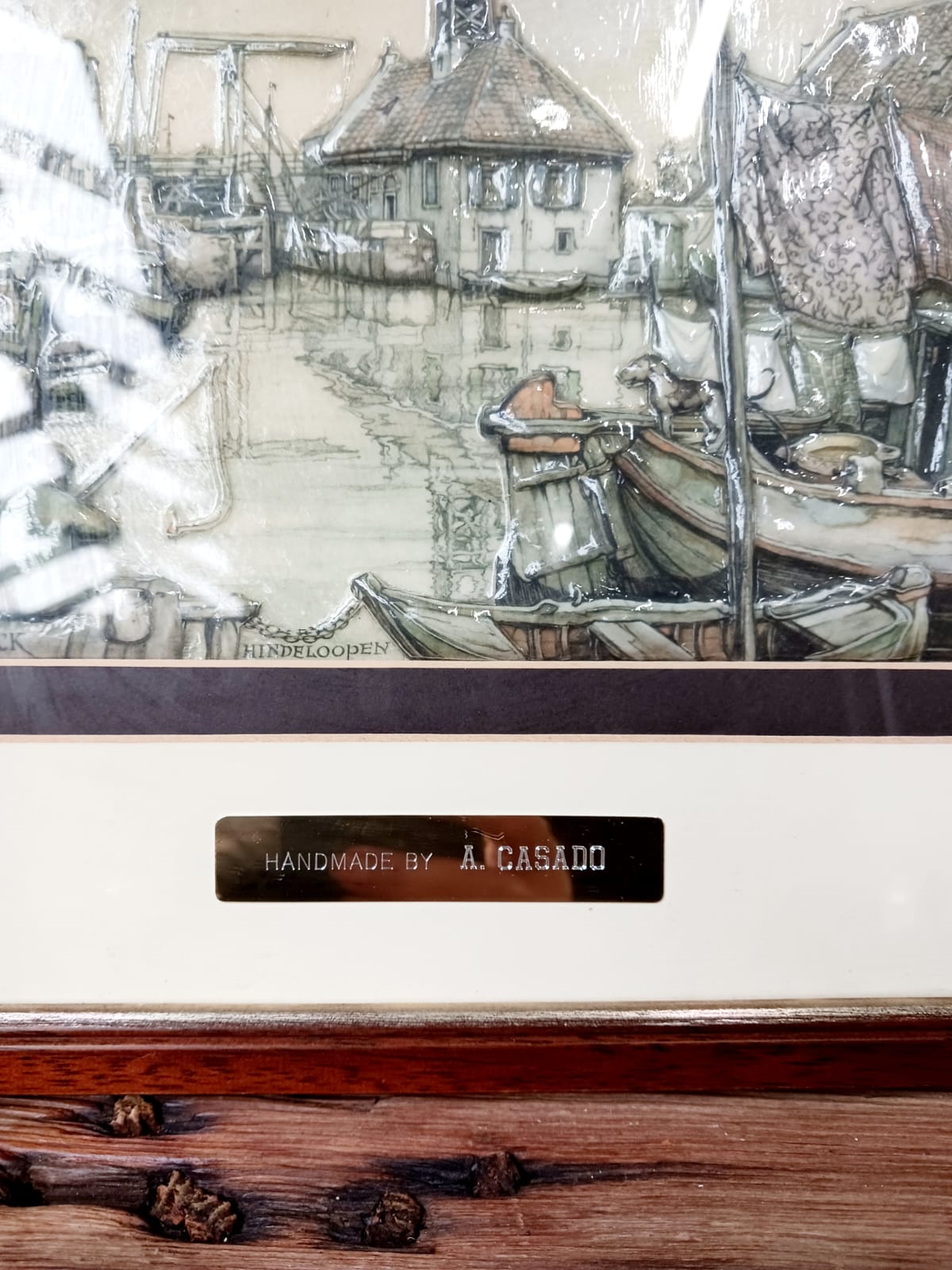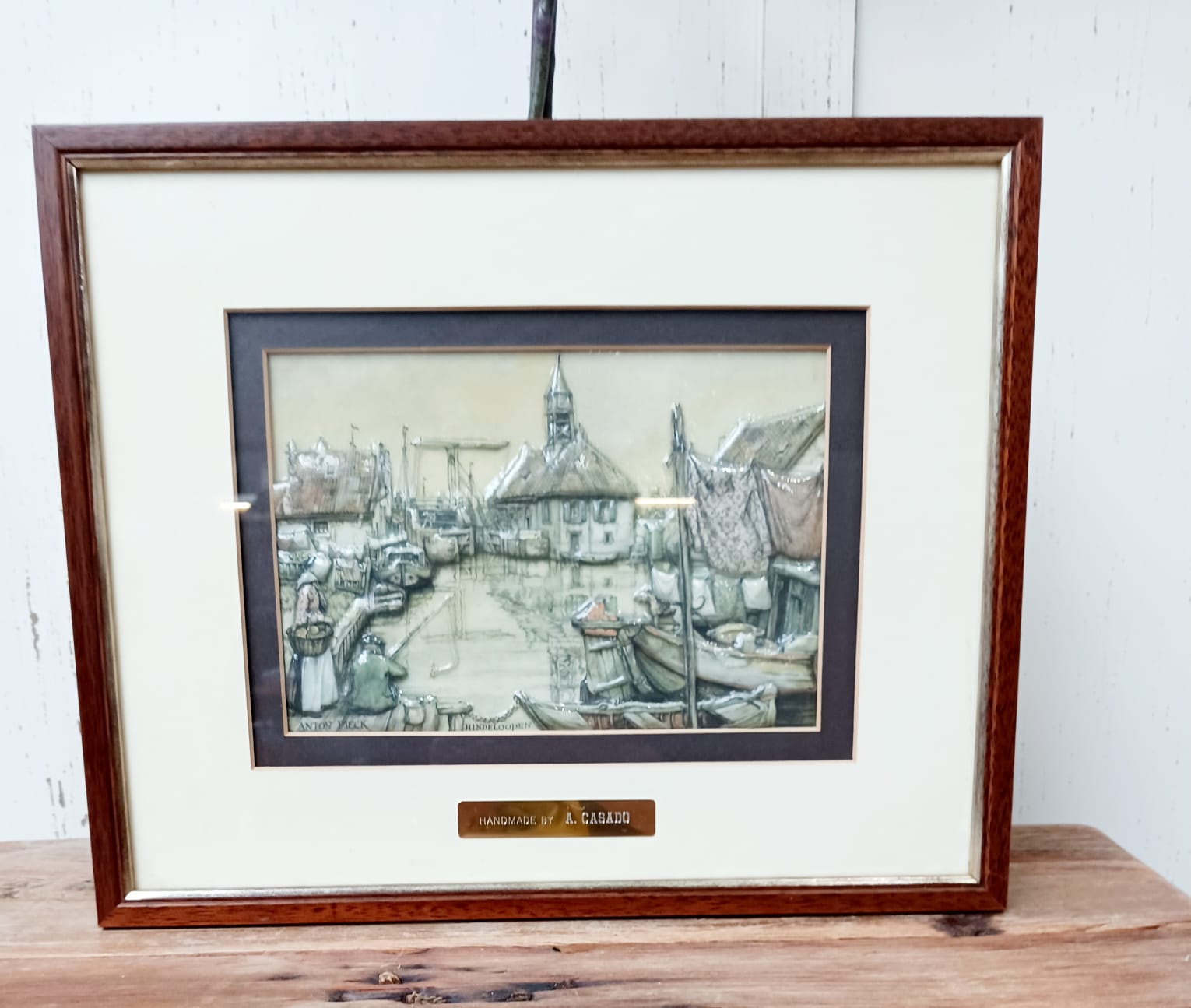 - “Anton Pieck” hindelopen kunstwerk/handwerk: A. Casado 3D porselein in oude lijst gesigneerd
