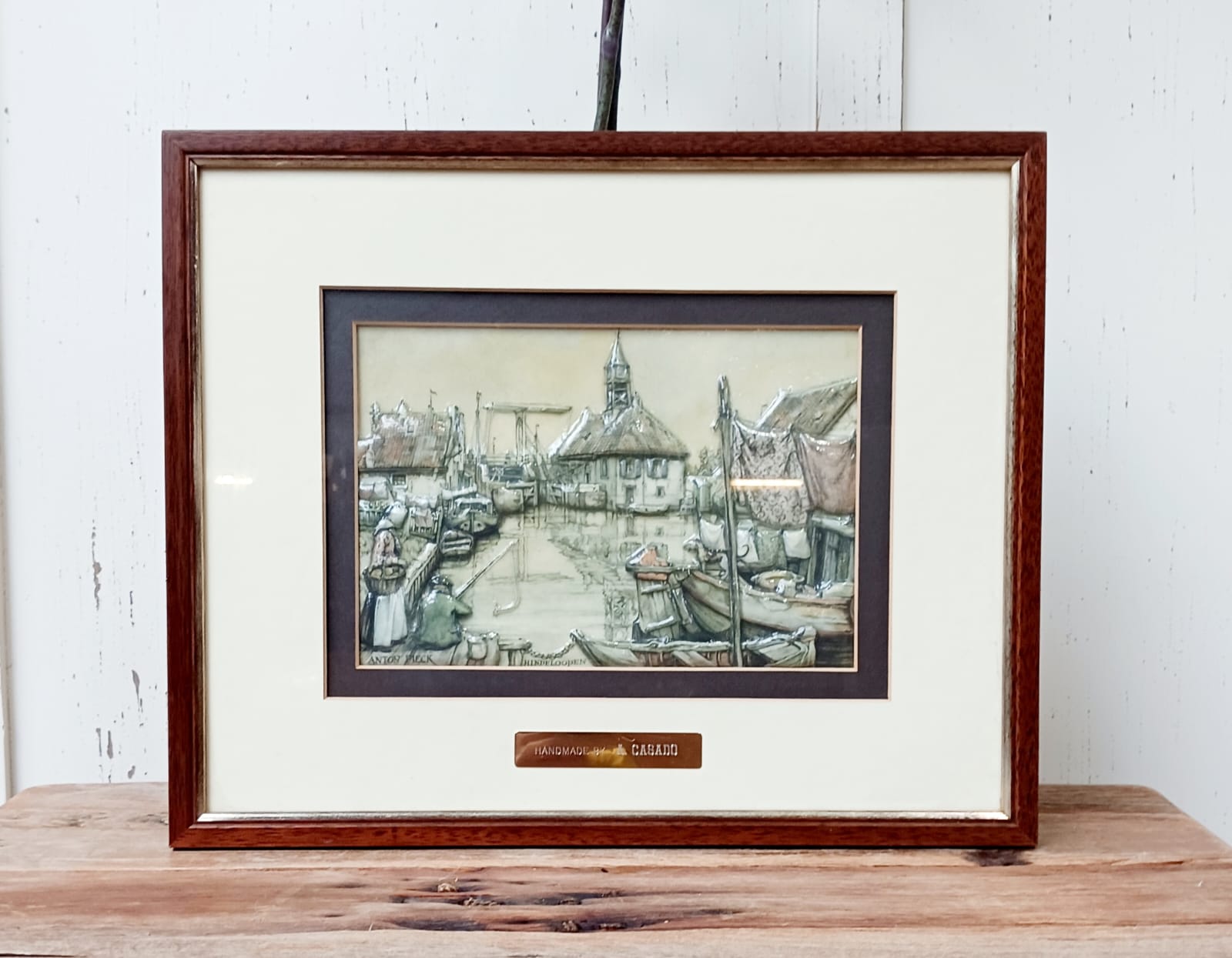 “Anton Pieck” hindelopen kunstwerk/handwerk: A. Casado 3D porselein in oude lijst gesigneerd