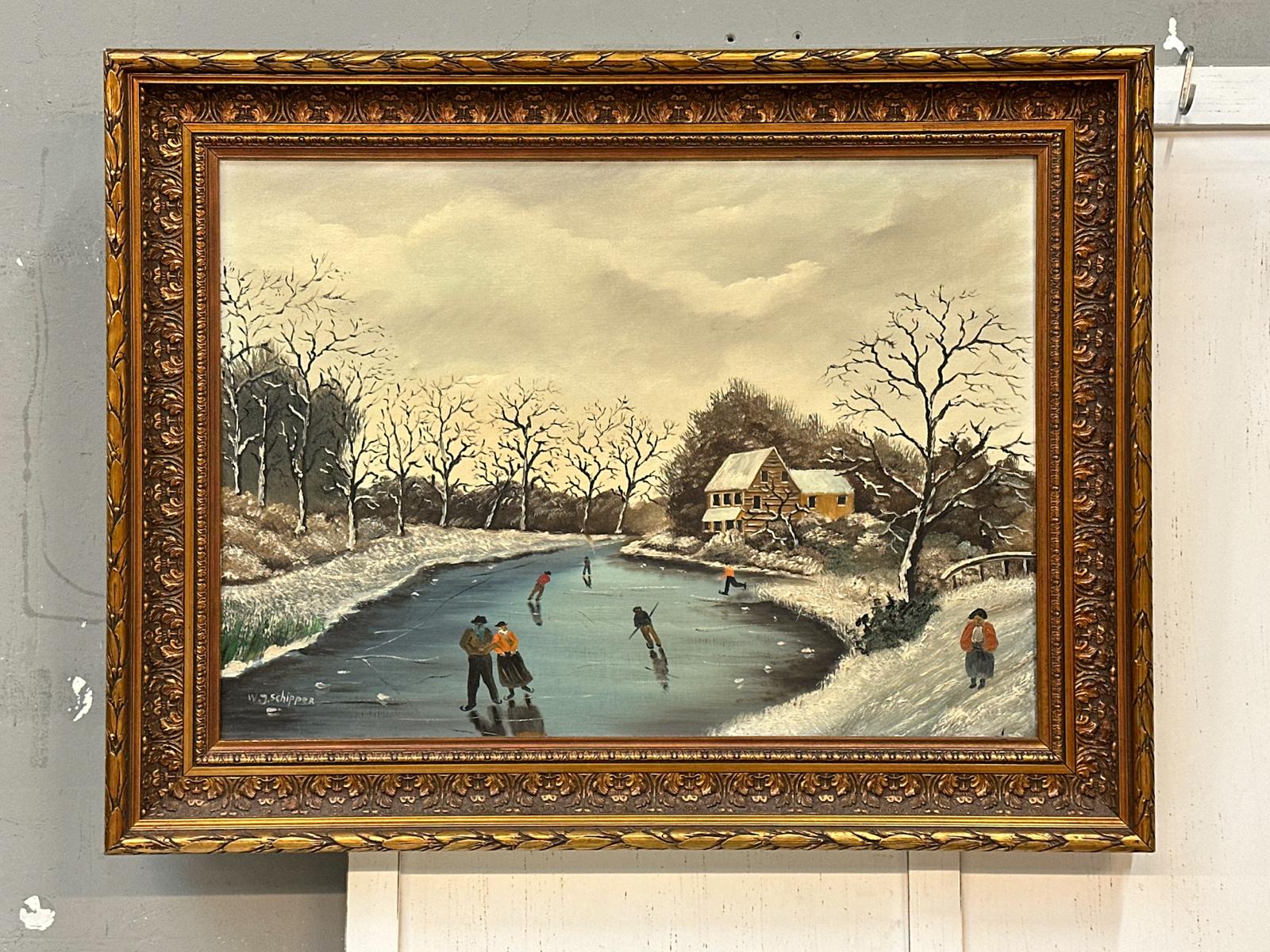 - Grote olieverf schilderij in prachtige oude lijst “winterdag” gesigneerd