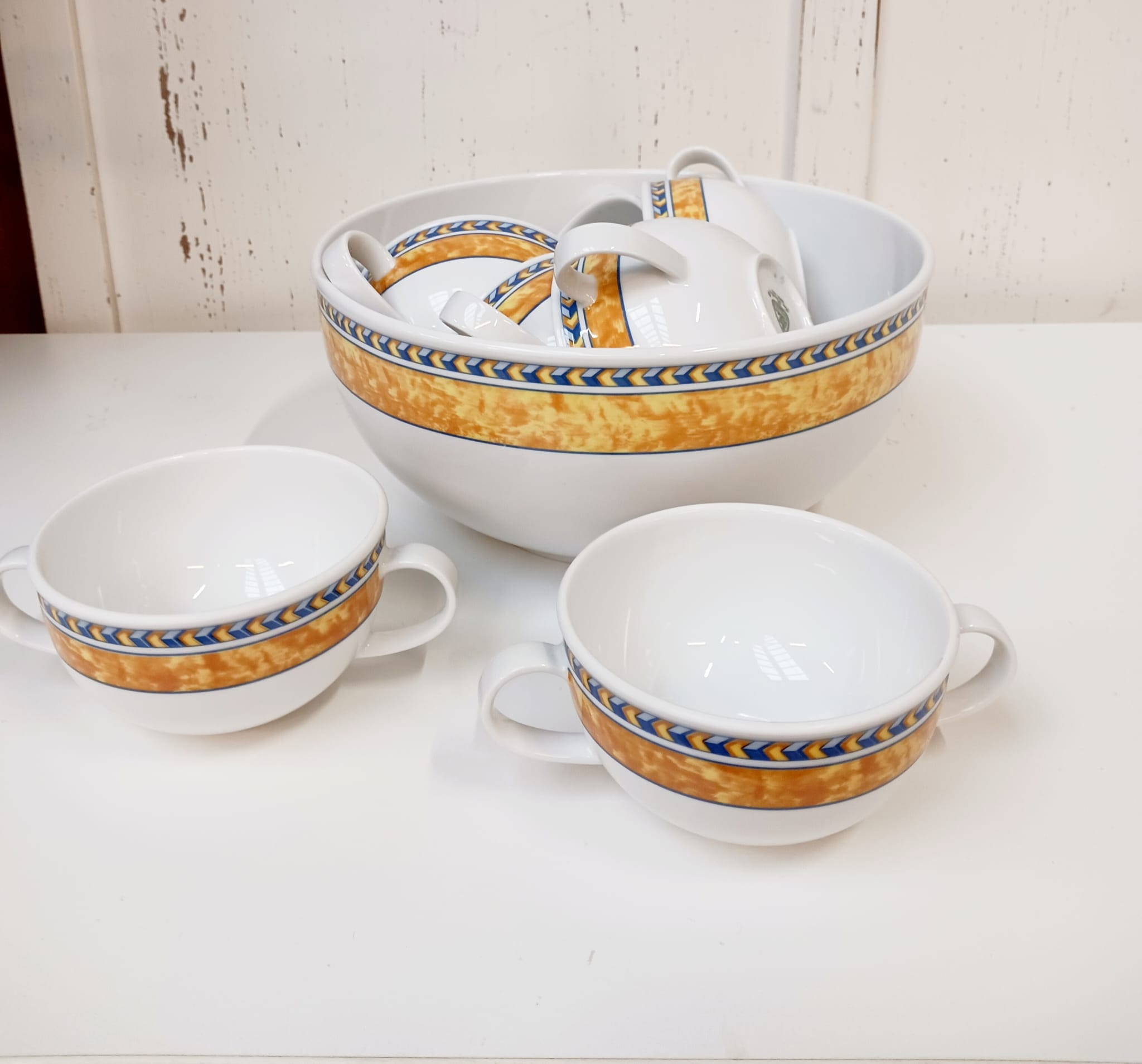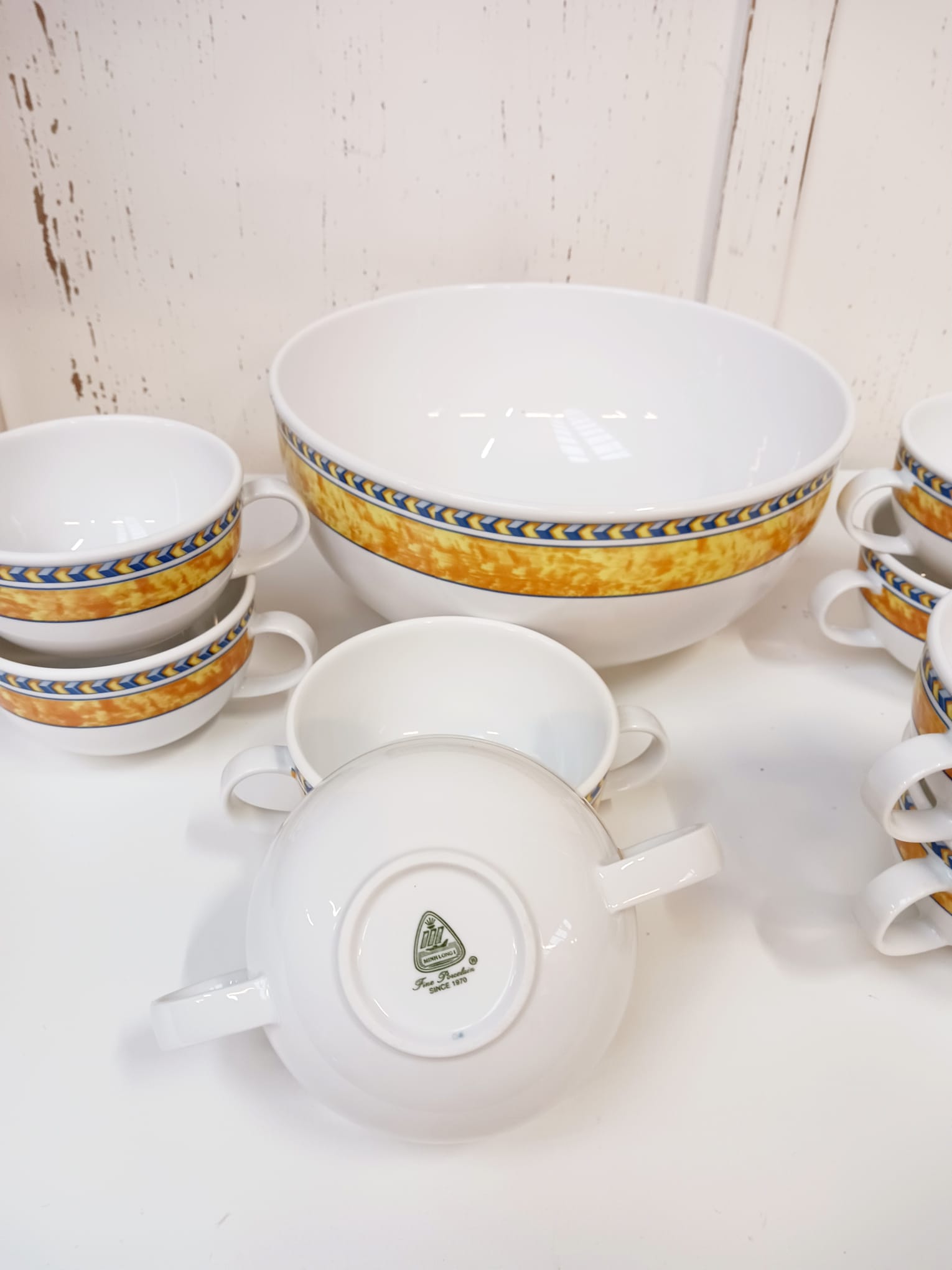 Grote porseleinen soep serveerkom ( diameter:27 cm en h:12 cm) + 8 soepkommen uit Vietnam