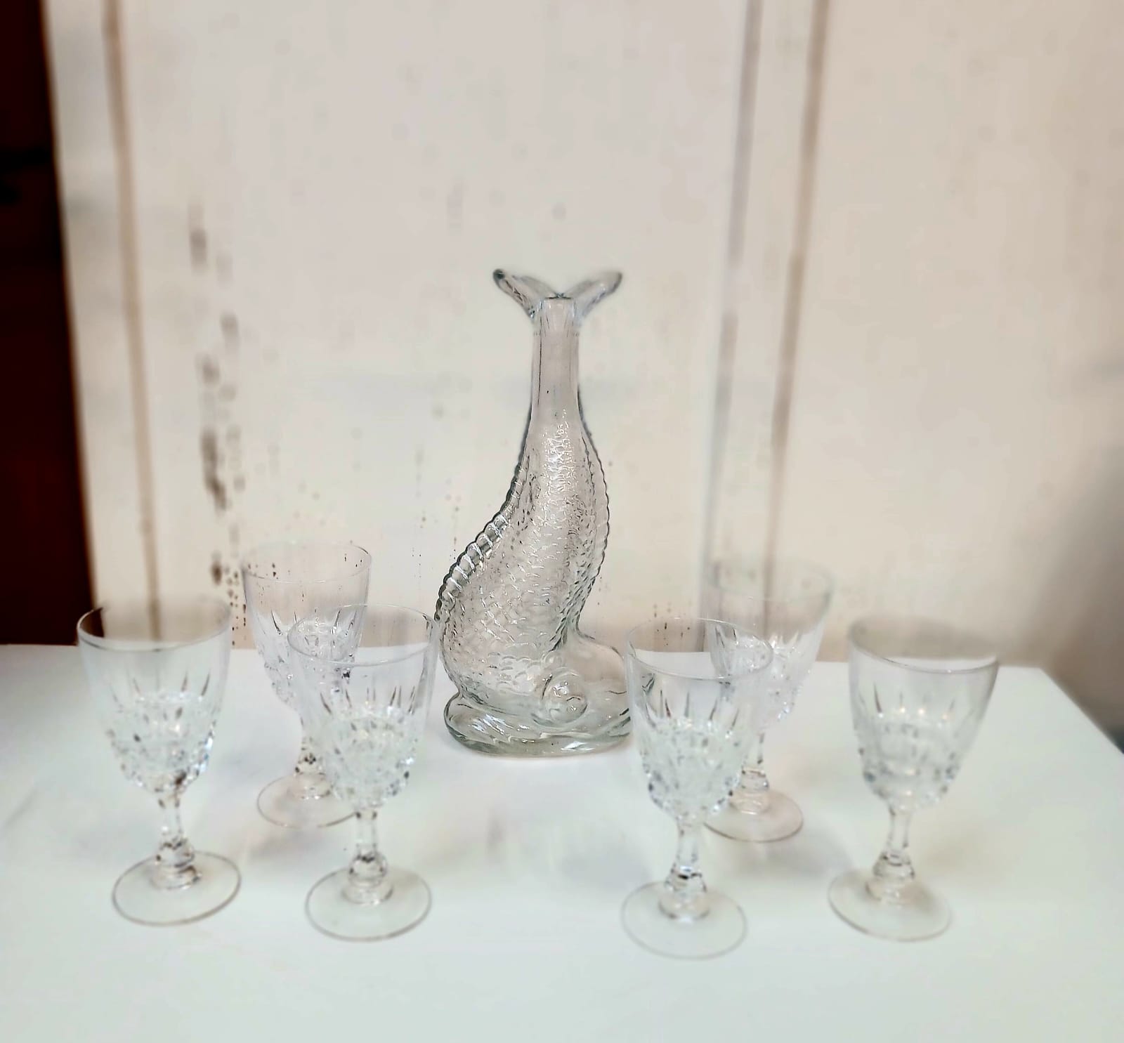 Jaren 70 vis karaf met 6 kristallen wijnglazen
