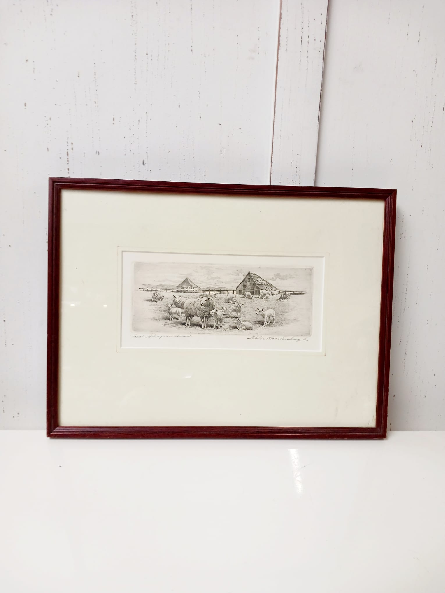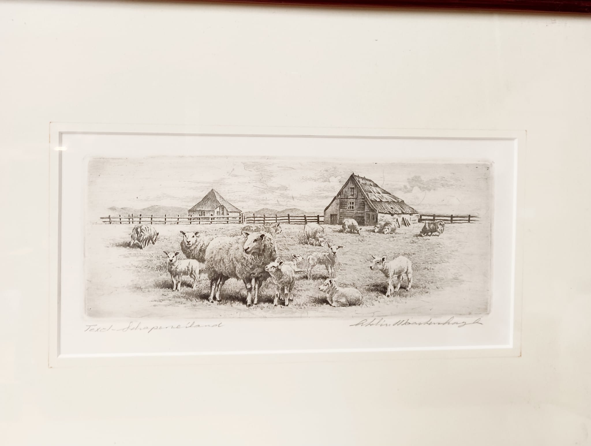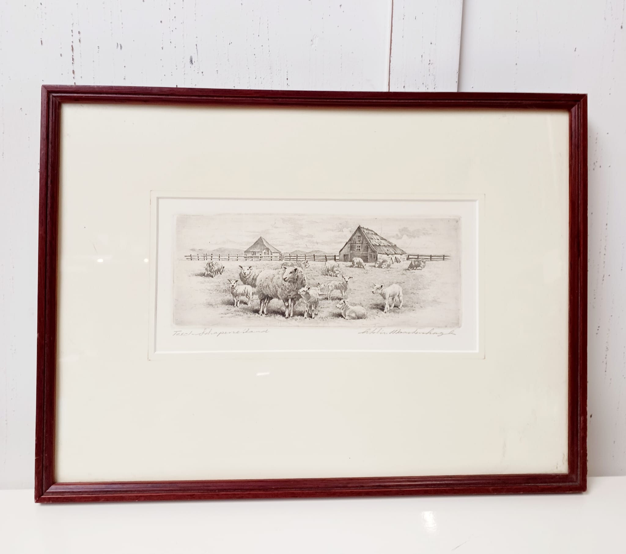 Prachtige vintage ets van Marten Langbroek Texel schapeneiland gesigneerd