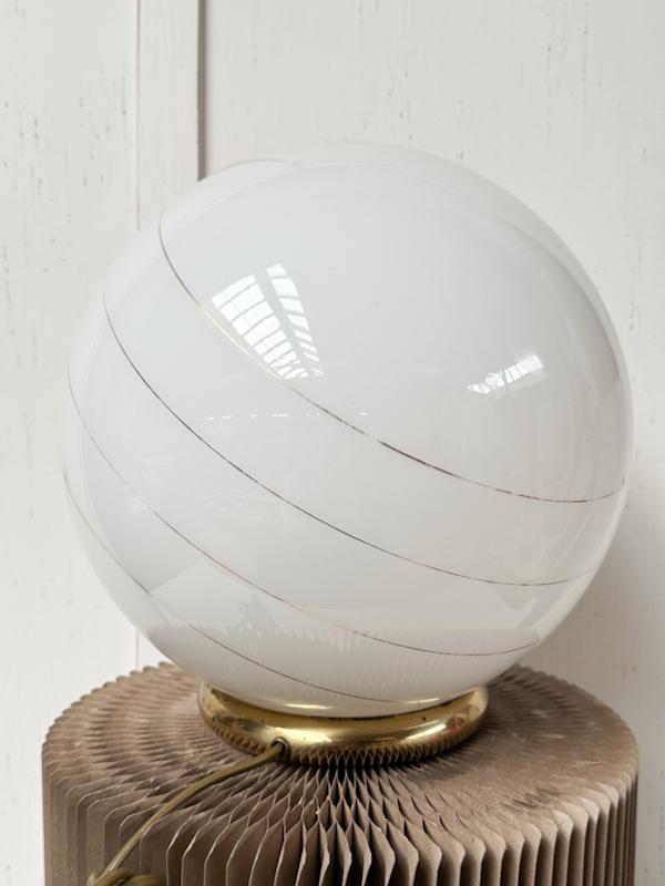 Vintage melkglazen bol tafellamp met gouden streep erop getest
