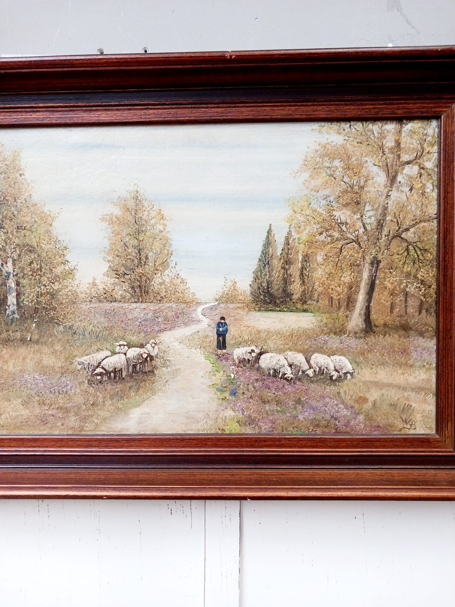 - Vintage olieverf schilderij op doek in ode lijst (herder met schapen) gesigneerd