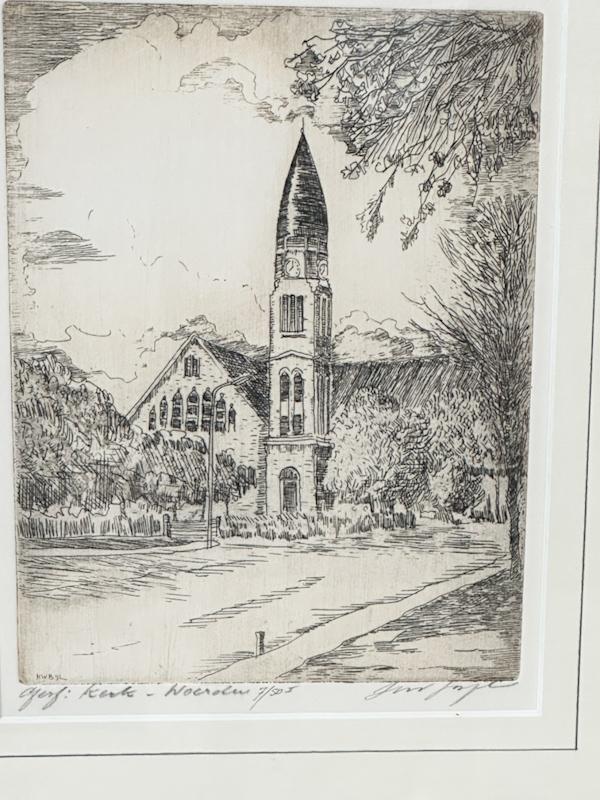 - Vintage oude zeefdruk kerkgebouw Woerden in oude lijst gesigneerd