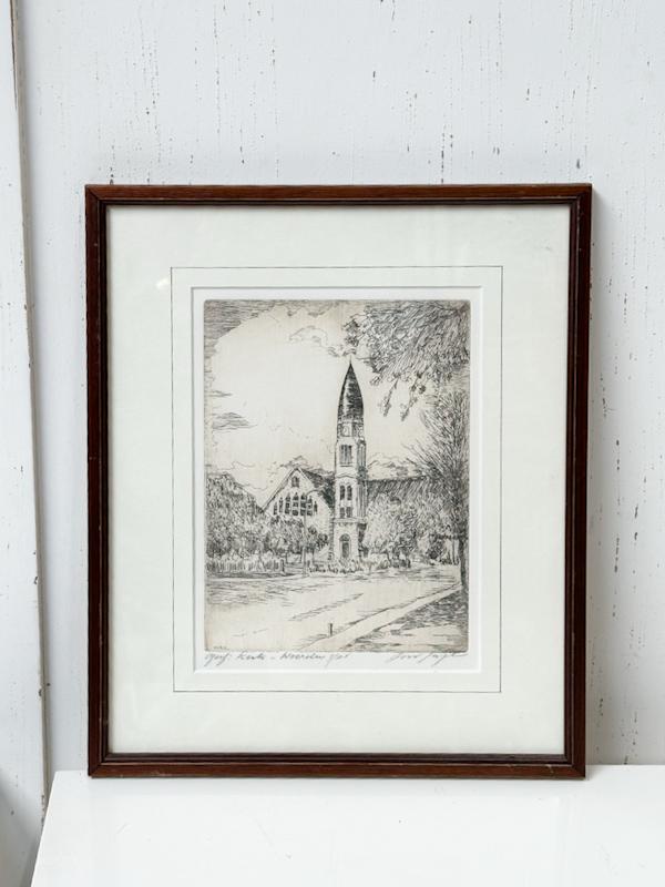 Vintage oude zeefdruk kerkgebouw Woerden in oude lijst gesigneerd